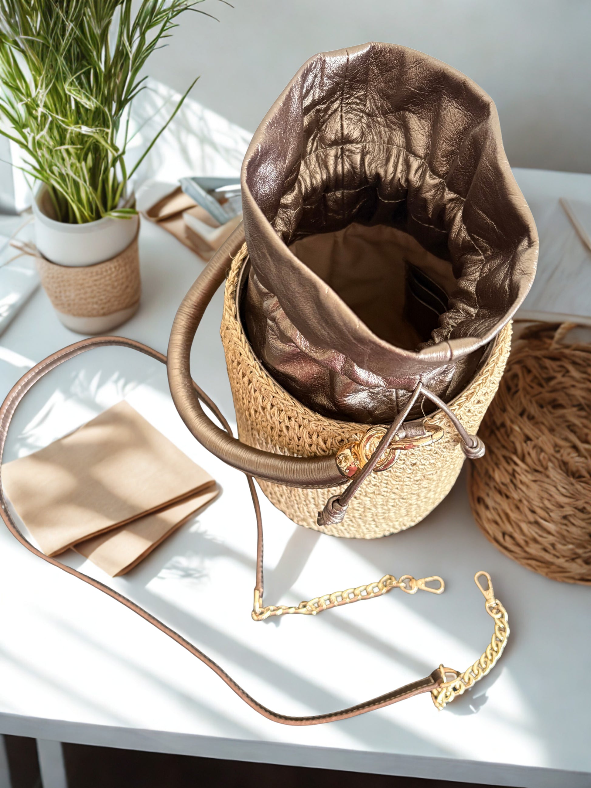 El Bolso Luna Bronce es la combinación perfecta entre lujo artesanal y diseño contemporáneo. Su estructura de cubo (bucket) cilíndrico resalta la fuerza de la cabuya de fique tejida a mano, combinada con la elegancia del cuero en color bronce metálico, que aporta brillo y sofisticación.